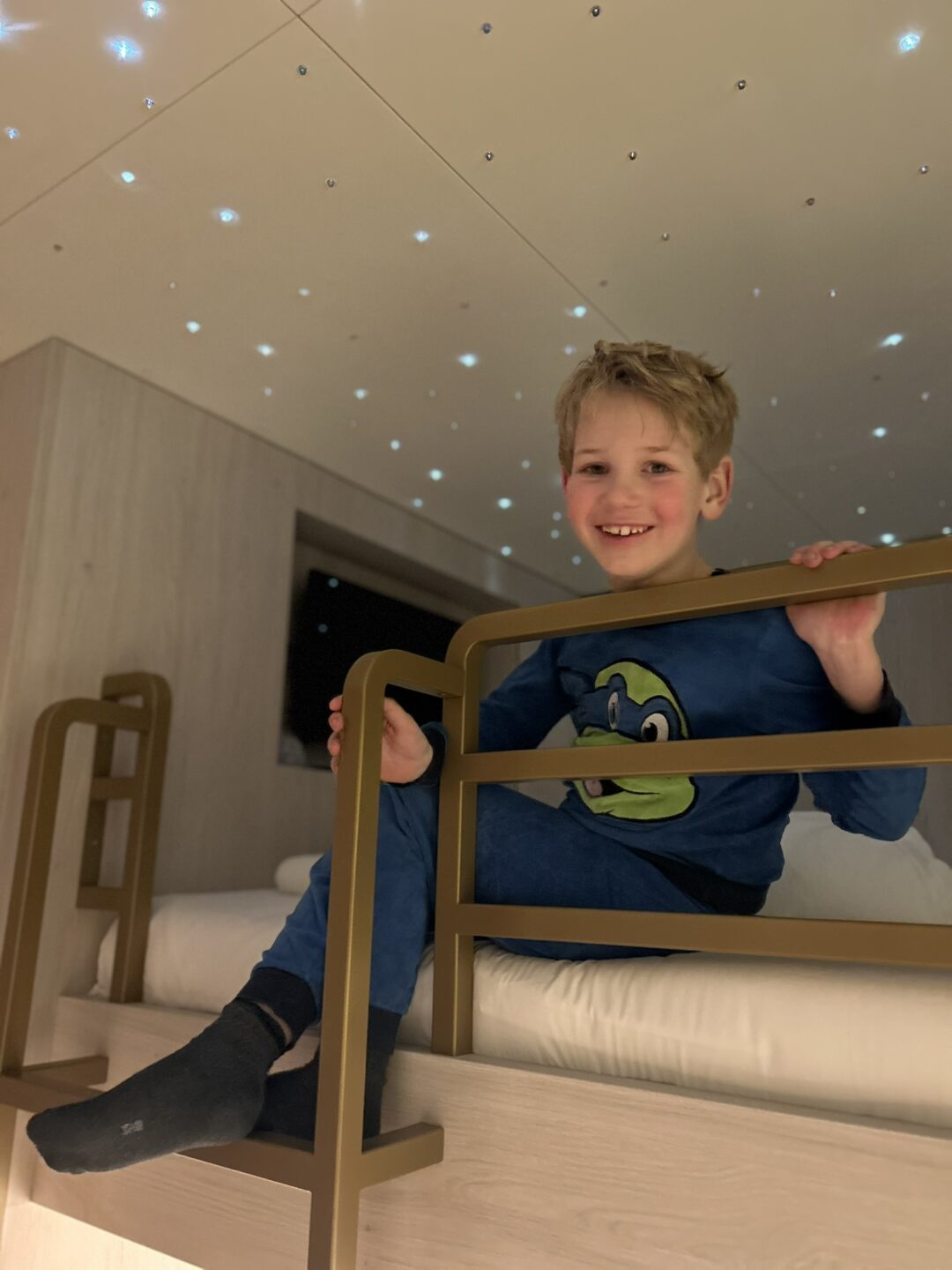 Onze kamer was een Beach Suite en die bleek onwijs mooi en sfeervol ingericht voor gezinnen. Geen standaard hotelkamer waar je puzzelt met koffers en kinderbedden, maar een ruimte waarin alles klopt en een slimme plek heeft gekregen. Het dubbel stapelbed (lees: 4 persoons!) was direct een hit bij onze jongens. Met zelfs twee eigen tv’s! Het geluid kwam via koptelefoons, zodat je geen hinder van elkaar hebt. En de fonkelende sterrenhemel maakte het helemaal compleet.